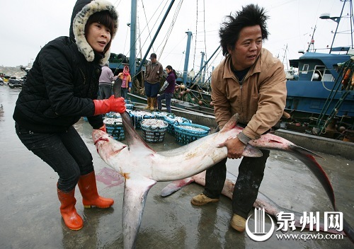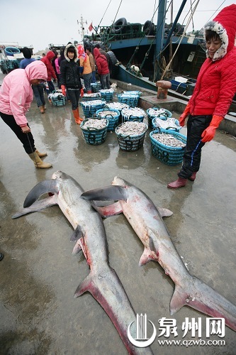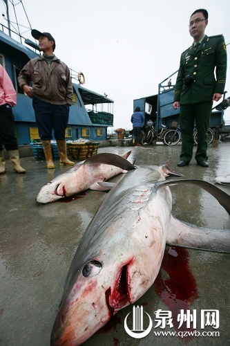 17日上午,石狮祥芝国家中心渔港人声鼎沸,车船来往,渔民们忙着卸下满仓刚刚捕捞回来的海鲜。在渔港一角,两条大鲨鱼格外引人注目。