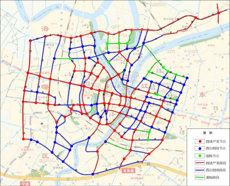 从空间分布上看,海曙核心区是目前交通拥堵最为集中和严重的区域;过江交通、跨铁路通道、中心区—鄞州联系通道、中山路、联丰路—柳汀街—药行街、环城西路,则是拥堵的常发路段。外围道路如通途路、环城北路的拥堵,主要以某些交通节点如道路交叉口拥堵为主(如左图)。
