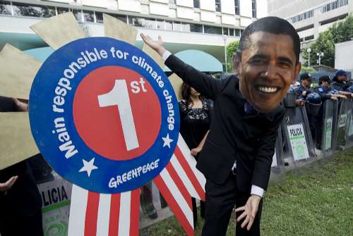 绿色和平组织成员戴着奥巴马的面具,抗议美国政府的气候政策。