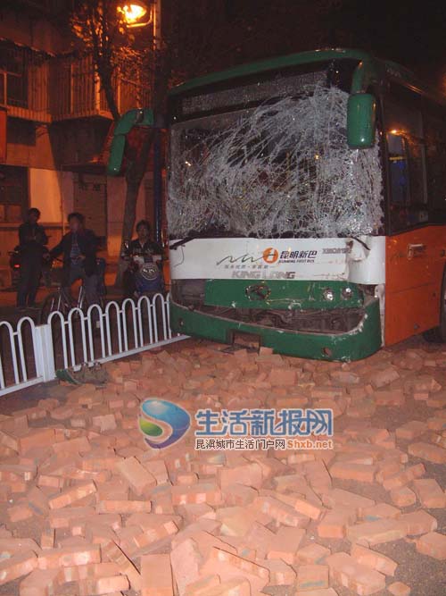 前日23时30分,当记者闻讯赶到现场时,看到公交车停靠在机动车道边,车头被撞得凹了进去,前窗玻璃已经粉碎,车前掉了一地砖头(上图),二大队的交警正在事故现场勘查和维持秩序。