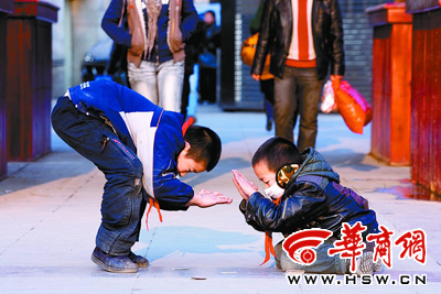 昨日下午4时许,西安钟楼附近的金花广场上,两个西一路小学三年级的学生放学后趴在地上玩起了拍画片。