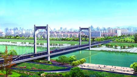 据介绍,有关部门拟投资约1.14亿元人民币拆除原危旧老桥,在原址新建一座运河大桥(命名为“运河之都特大桥”),桥型方案经市规委会审批采用“双索面双塔自锚式预应力混凝土悬索桥”。项目起点位于车站西路八里庙西岸原有道路,通过路堤起坡,以桥梁方式跨越西岸大堤、梁济运河,止于滨湖路,与滨湖路T形平交,全长530m,其中大桥全长396m,接线路堤长134m。主桥为自锚式悬索,桥宽37.5m。采用双向六车道,另加2×3m非机动车道和2×2m人行道,设计行车速度60Km/h,设计荷载:公路-Ⅰ级,人群2.4KN/m2。工程于2009年12月18日开工建设,建设工期为24个月,预计2011年建成通车。