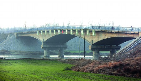 16日下午4时许,记者来到八里庙大桥。在桥的东头记者看到,工作人员正在搭建17日上午开工典礼用的舞台。桥东侧两旁的树木已经放倒,三三两两的行人正从桥上通过。沿桥而上,桥两侧静静地停泊着运煤的船只,桥两侧的护栏已经锈迹斑斑,桥面也破损不堪。大桥在夕阳的映照下显得那样的宁静安详。