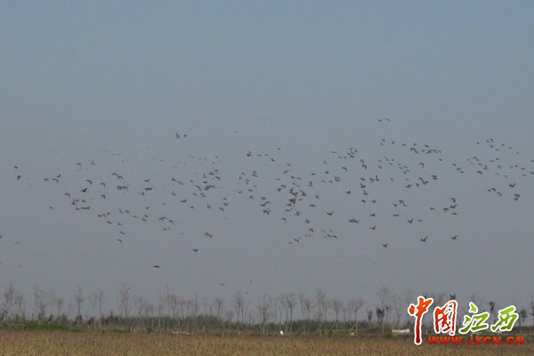 栖息在东滩湿地的候鸟漫天飞舞。(江西网记者 余益 摄)