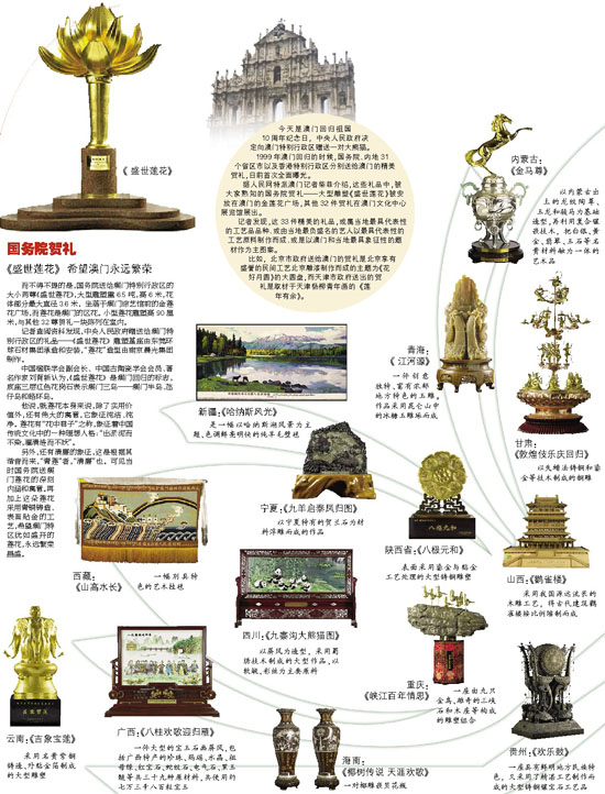 比如,北京市政府送给澳门的贺礼是北京享有盛誉的民间工艺北京雕漆制作而成的主题为《花好月圆》的大圆盘,而天津市政府送出的贺礼是取材于天津杨柳青年画的 《莲年有余》。