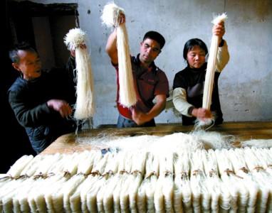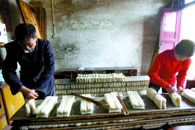 沙坊村中大部分人家都会做沙坊粉,有村民闲来无事,会逛到村中各沙坊粉作坊里,走走看看,拉拉家常,帮忙包扎一下粉丝