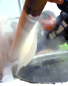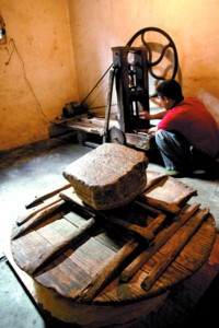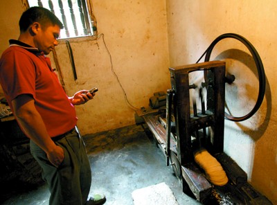 沙坊村下寨42号石内成守在切粉机前,等着切粉机吐出“粉丝”。他们全家的主要收入都靠制作“沙坊粉”。