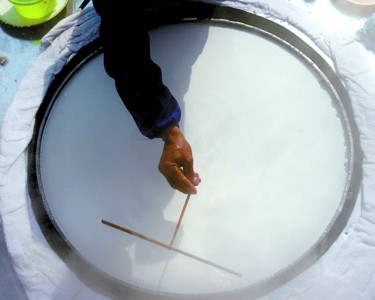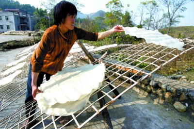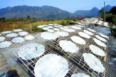 只要是晴好天,沙坊村村前村后的空地便会摆上不少竹制簸箕,那是用作晾晒沙坊粉的工具。一大片白色粉皮挨着摆在一起,煞是壮观。