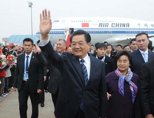 12月19日,国家主席胡锦涛乘专机抵达澳门。这是胡锦涛主席向欢迎人群挥手致意。新华社记者 樊如钧 摄