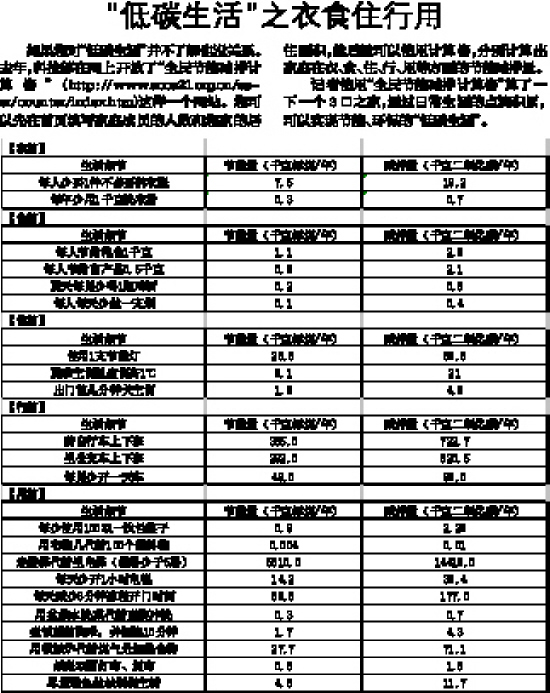如果您对“低碳生活”并不了解也没关系。去年,科技部在网上开放了“全民节能减排计算器”(http://www.acca21.org.cn/eser/counter/index.htm)这样一个网站。您可以先在首页填写家庭成员的人数和您家的居住面积,然后就可以使用计算器,分别计算出家庭在衣、食、住、行、用等方面的节能减排量。