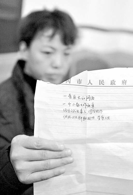 20日,刘月红出示了她在杨宽生的屋子里发现的一张字条,这张题头为“武冈市人民政府”的信笺纸上,用黑色钢笔写着:“一条巨大的网络,一个小题大做的文章,终于试出来了,阴险狡诈,但我必须肝胆相照,荣辱与共。”没有落款,也不知道是什么时候写的,刘月红说,那是丈夫的笔迹。
