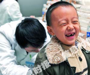 小朋友贴药,呲牙咧嘴。信息时报记者 叶伟报摄