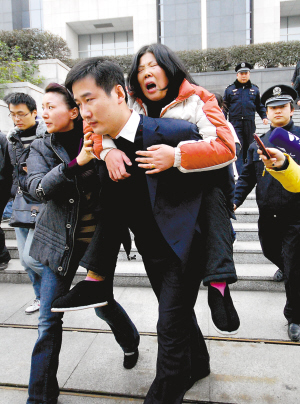 一名受害者的母亲对判决结果不满意,情绪失控,被背出法院。