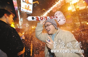 也许是解放碑早早的“禁入”管制,引起人潮“回流”。昨夜,沙坪坝三峡广场人满为患,中心地区行走拥堵,狂欢的人们互相砸着“狼牙棒”,喷起“飞雪”,整个场面很是热闹。直到凌晨,人群才逐渐散去。