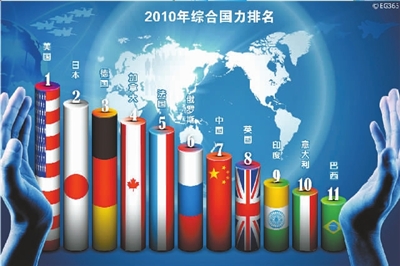 据报道,《国际形势黄皮书》选取了西方七国和“金砖四国”作为评估对象,评估的指标体系包括领土与自然资源、人口、经济、军事、科技五个直接构成要素,以及社会发展、可持续性、安全与国内政治、国际贡献四个影响要素。11个国家的综合国力排名顺序为:美国、日本、德国、加拿大、法国、俄罗斯、中国、英国、印度、意大利、巴西。中国排名第七。