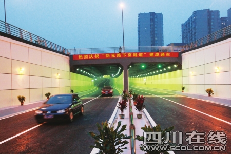 昨日傍晚,成都高新区新光路下穿隧道正式通车,这标志着高新区南部园区又一条连接中心城区的大动脉被打通。隧道地处成都城南繁华地带紫荆片区,全长670米,北起机场路、南至春和二街,设计为双向4车道,总投资1.5亿元。该隧道建设应用了橡胶沥青、卡索板和高频无极节能灯等多项环保新技术和材料,可以说是成都已竣工的最环保下穿隧道。