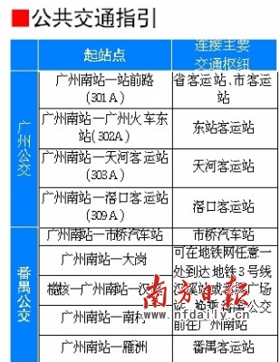 广州市交委有关负责人介绍说,广州南站运营后,近期将至少有9条公交线直达广州南站。其中,由广州市区开往广州南站的公交车有从广州站前路开出的301A、广州火车东站开出的302A、天河客运站开出的303A、滘口客运站开出的309A,而其他从番禺开往广州南站的还有5条公交线。除这些公交车外,市民们还可以乘坐地铁3号线到汉溪站,再换乘番禺区公交线路(汉溪———榄核),途经广州南站。同时,在深圳、东莞、中山、珠海、江门、佛山、惠州等珠三角城市均有直达长途班线到达广州南站汽车客运站。