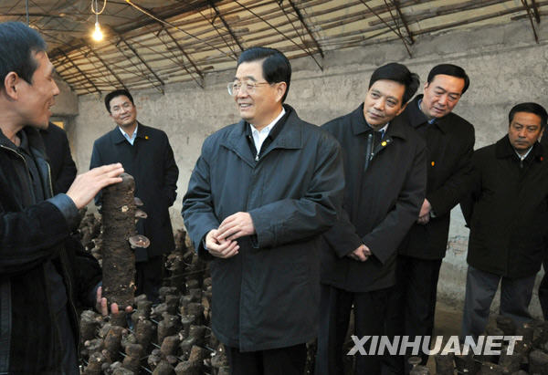 1月1日,中共中央总书记、国家主席、中央军委主席胡锦涛到河北省三河市农村考察。这是胡锦涛在三河市李旗庄镇李旗庄村香菇大棚里,了解香菇种植专业合作社带动农民增收情况。新华社记者李学仁摄