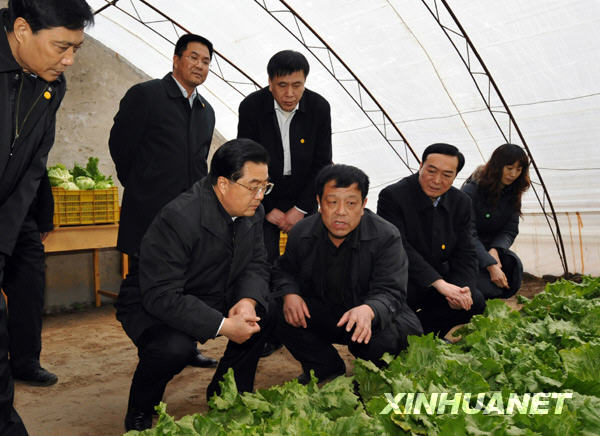 1月1日,中共中央总书记、国家主席、中央军委主席胡锦涛到河北省三河市农村考察。这是胡锦涛在三河市李旗庄镇李旗庄村生菜大棚了解冬季农业生产情况。新华社记者李学仁摄