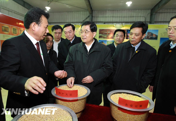 1月1日,中共中央总书记、国家主席、中央军委主席胡锦涛到河北省三河市农村考察。这是胡锦涛在三河汇福粮油集团有限公司了解生产经营情况。新华社发