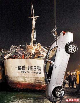 搜救人员吊起落海的轿车。 来源:台湾《苹果日报》