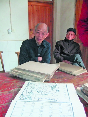 曹典钦(左)搬出一大叠老族谱,让记者查看。李广军 摄