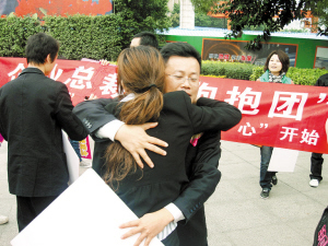 深圳特区报讯 (记者 何泳 文/图)“亲爱的朋友,让我们抱一下吧!” 昨日下午3时30分,“爱心美女抱抱团”和“企业总裁抱抱团”成员在荔枝公园前相聚,100多名帅哥、美女当街“索”抱,一时成为风景。