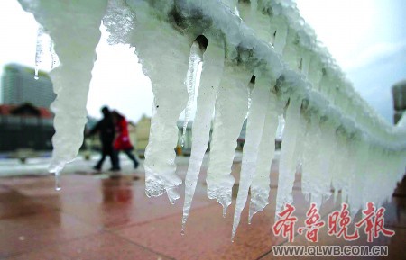 3日,烟台市滨海景区,两位游客从冰挂前走过,当日最低温度在-8℃左右。记者赵金阳摄
