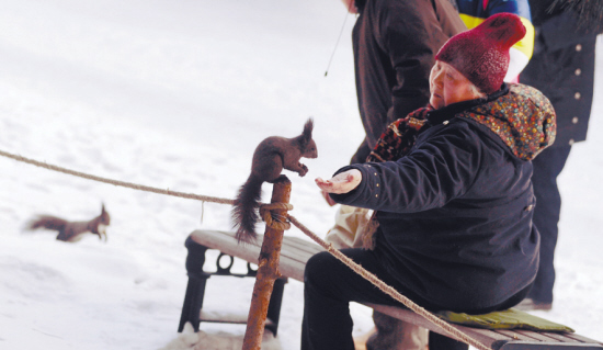 镜头二:早上8时45分,一位70多岁的大娘用浑厚的嗓音呼喊“开饭啦!”顿时,空中响起叽叽喳喳的叫声,四面八方的喜鹊像箭一样冲到距北陵西门300米的地方,近十只松鼠也应约到来。这时,十几双拿着花生的手伸出来,小东西排成队到手中取食。一棵树下,一位老汉和几名来运动的女孩子从怀兜里掏出橘子等水果,一瓣一瓣剥好,放在雪地上,供吃完食物的喜鹊、松鼠们使用“饭后甜点”。