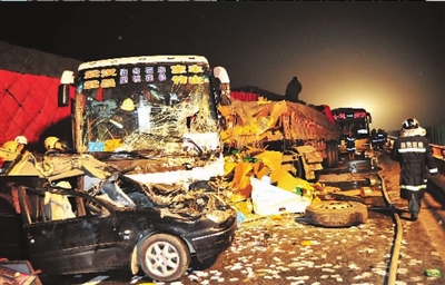 22时10分许,号牌为鲁FC2518的半挂大货车行驶至该路段时,遇前方交通受阻在车道内停车,被随后而来的鄂AZU659小轿车、鄂A49183大型客车追尾相撞。紧接着,一辆号牌为鄂C83211的半挂大货车由后方驶来,车头直接撞上鄂A49183大型客车尾部,造成大型客车上的2名乘客当场死亡、1名乘客情急之中跳桥身亡,14名乘客受伤。