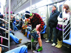 2010年1月10日寒冷的下午,纽约地铁里突然冒出一群不穿裤子的乘客。他们有男有女,有的穿着短裤,有的穿着贴身内裤,令其他乘客大吃一惊。原来他们是在参加第9届“不穿裤子乘地铁”活动。