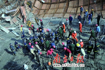 脚手架倒塌3死7伤 南方日报 2010.01.1308:20 关注 昨日11时50分左右,安徽省芜湖华强文化科技产业园配送中心工地混凝土浇筑过程中发生脚手架倒塌事故(左图为事故现场),10余名工人被压在脚手架下,已有3死7伤,多人生死不明。