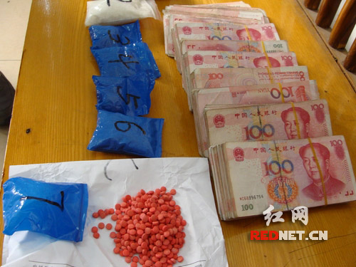 (1月13日凌晨,湖南株洲天元警方破获一起毒品案,缴获麻古1402粒,冰毒120多克以及毒资7万多元。青琪摄)