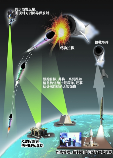 记者从相关部门了解到,所谓陆基中段反导弹拦截技术主要由拦截器、传感器和战斗管理系统组成,用来对敌方弹道导弹进行探测和跟踪,然后从陆地上发射拦截器,在敌方系统弹道导弹尚未到达本土之前,对其拦截并将其战斗部摧毁。