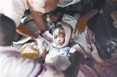 一名受伤的儿童在接受救治。