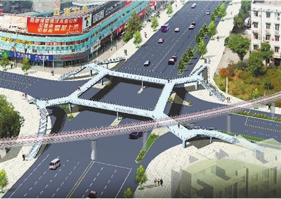 天桥位于中山路与民主路相交路口,主桥净宽4米。桥建集团介绍,这座天桥类似钟家村路口的人行天桥,不同的是它中间的造型类似方形。方形的每一个角对接4个路拐角,分别伸出一个坡道和一条梯道。