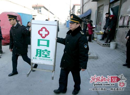 本报讯(燕赵都市报记者刘伟)根据群众举报线索,市卫生监督局、裕华区卫生监督所执法人员于1月13日上午联合行动,对位于南王村内的诊所进行突击检查,一家口腔诊所因未取得《医疗机构执业许可证》而被当场取缔。