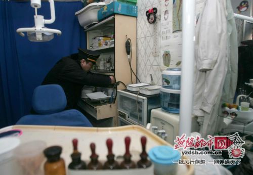 13日9时30分左右,记者随同执法人员赶到了南王村。在对一家口腔诊所进行检查时,执法人员发现该诊所不足20平方米,除门口摆放着一块标有“口腔”的牌子外,没有任何标志。屋内生着煤火,既无紫外线消毒灯,也没有用于口腔器械消毒的设施,一只镊子上甚至还带着锈斑。经查,该诊所未取得《医疗机构执业许可证》,执法人员当场对该诊所予以取缔,并张贴了取缔通告。