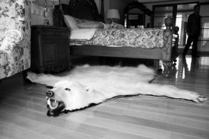 两侧的卧房是乡村田园风格,精巧考究的橱柜,素净的小碎花铺满床,深红色的木地板,主人的卧室里的北极熊皮毛地毯,书架前排摆放着在各种公私场合的合影,仔细看这些图片,竟有不少熟悉的公众人物:洪金宝、王石、杨澜、陈鲁豫、窦文涛……房间落地玻璃窗外,木制的露台伸出去便是大海。