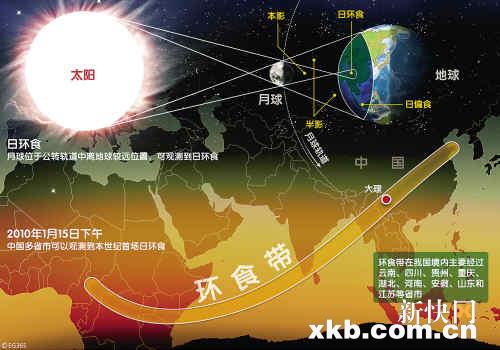 即将发生的日环食,是本世纪首次在我国出现的日环食,也是未来1000年里持续时间最长的日环食。本次日环食从非洲中部开始,经印度洋、印度南部、缅甸等国家最后进入我国,全程将持续约5个小时,环食带宽达500千米以上。