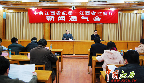 1月15日上午,江西省纪委、省监察厅举行新闻通气会,省纪委副书记徐必鸿通报了2009年江西党风廉政建设和反腐败工作情况。(江西网记者 邓小勇 摄)