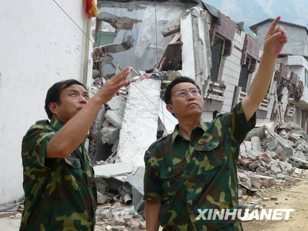 山东援建者崔学选(右)在北川查看房屋受损情况(资料照片)。新华社发