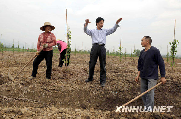 2009年4月23日,江苏丘陵地区镇江农业科学研究所研究中心主任刘照亭(中)在给绵竹市农民讲解梨树的管理技术。新华社记者 陈燮 摄