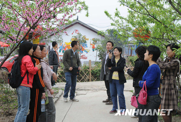 2009年3月25日,游客在地震灾区绵竹市棚花村花前留影。四川绵竹市棚花村在汶川大地震中被完全摧毁,经过恢复重建,这个小村庄已重新焕发生机。