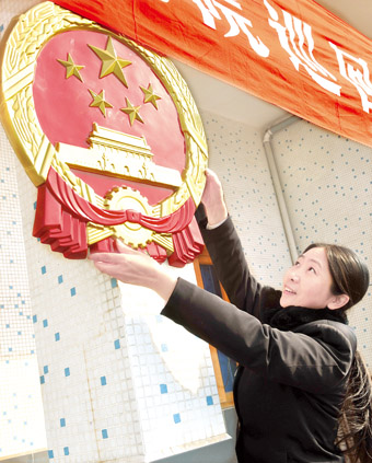 图为在江苏省靖江市东兴镇合兴村,巡回法庭休庭后,陈燕萍取下国徽。?新华社记者金良快摄