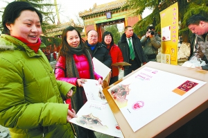 图为几名游客将雍和宫新春祈福幸运封寄出,为亲朋好友送上新春祝福。