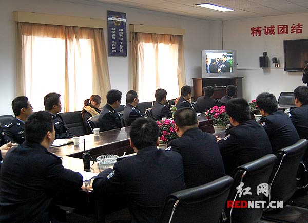 (1月20日上午,长沙市特巡警支队三大队的干警们收看北京举行中国驻海地维和警察的八位烈士遗体告别仪式的电视直播。)