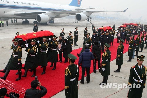 1月19日,运送八位中国维和英烈灵柩的中国南方航空公司包机抵达北京首都国际机场。中共中央政治局常委、中央政法委书记周永康,中国国务委员、公安部部长孟建柱到机场迎接。 中新社发 富田 摄