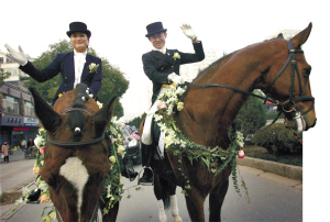 温州网讯 昨天,新郎贾海涛选择以骑马的方式,迎娶新娘朱紫娟。贾海涛来自内蒙古,在温工作6年,是浙江省马术队主教练、温州凯易路马术俱乐部的经理。新娘朱紫娟是温州人,常去马术俱乐部骑马,两人因此相识相恋,前后已有5年时间。这5年中,他们一起骑马、谈马,有着说不完的共同话语。新郎新娘骑的马分别来自丹麦和德国,浙江省马术队队员曾骑着它们在去年全运会比赛中获得过铜牌。新郎新娘是从市区纺织路出发,前往位于南浦路的一家酒店,路程仅一公里左右,并特地选择在下午3时左右车流较少的时候上路。郑鹏占昭昭摄