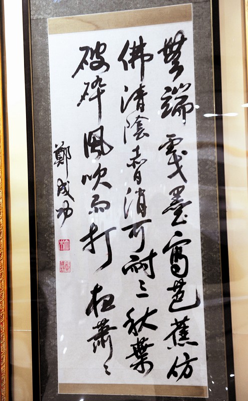 这幅字的收藏者、台湾中华收藏家协会理事长张建富解释说,这幅字前两句写心情,后两句写心境。诗是郑成功写的,可以窥见其当时孤臣孽子的心境。从字体笔法上看,第一句的“戏”字很有个性,右半边的“戈”不是在右边,而是在“又”的下面。这是郑成功的创意,其他地方是没有见过的。这幅书法作品,蕴含着一种英雄气概在里面。